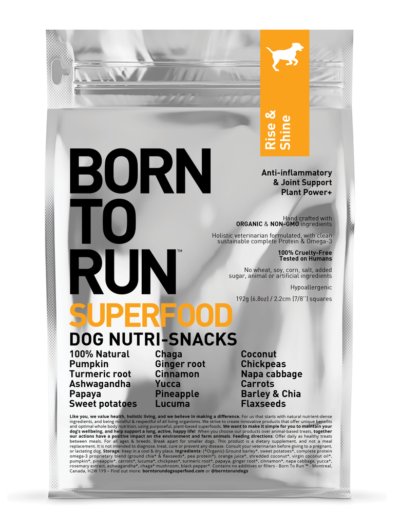Is there any better way to arise in the morning, then with our smiling dogs staring at us? (much better than the alarm clock, don’t you think?!). Our Rise & Shine blend was created with that feeling in mind, and knowing that our yellow-orange superfoods can help our pooches jump start each day, the right way! As inflammation is the root cause of any disease, we created a cocktail from 20 exceptional plant based anti-inflammatory ingredients, known to protect cartilage, help recovery after exercise, and promote overall joint & bones health.Â